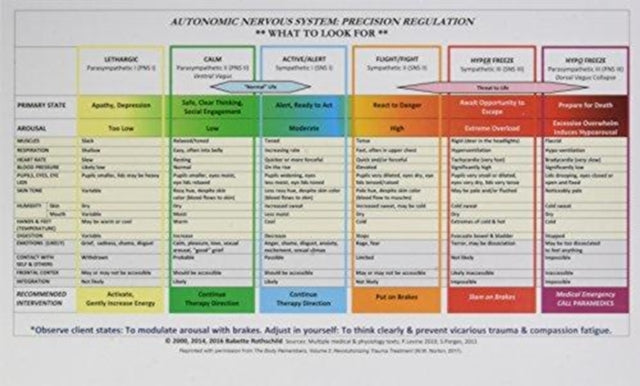 This product is a laminated 8-1/2 in. x 14 in. version of the Autonomic Nervous System table that appears in Babette Rothschild's The Body Remembers, Volume 2.